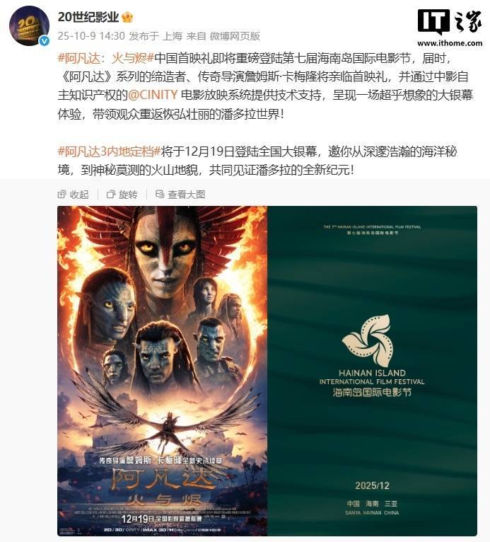 IT之家 10 月 9 日消息,据 20 世纪影业今日消息,《阿凡达:火与烬》中国首映礼将登陆第七届海南岛国际电影节,《阿凡达》系列的缔造者、导演詹姆斯・卡梅隆也将亲临首映礼。据介绍,《阿凡达:火与烬》中国首映礼通过中影自主知识产权的 CINITY 电影放映系统提供技术支持。